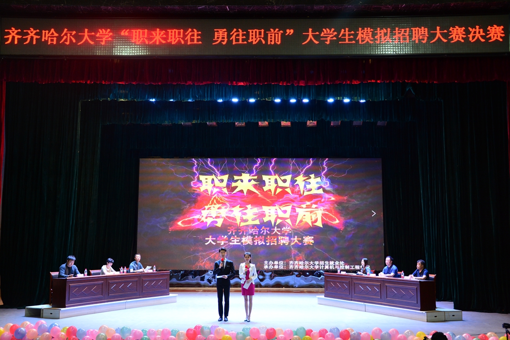 决赛现场,sunbet申搏艺术学院优秀硕士毕业生、成功创业者陈泓旭,百胜餐饮(沈阳)有限公司哈尔滨分公司人力资源部招聘主管李爽,齐齐哈尔益加科技有限公司总经理、0452e同城APP创始人刘昌龙董事长,华鹤集团人力资源部招聘经理、人力资源方向中级经济师刘婧,齐齐哈尔市雪光软件总经理徐光明,齐齐哈尔市佳维建筑设计有限责任公司董事长杨东风等应邀担任评委。