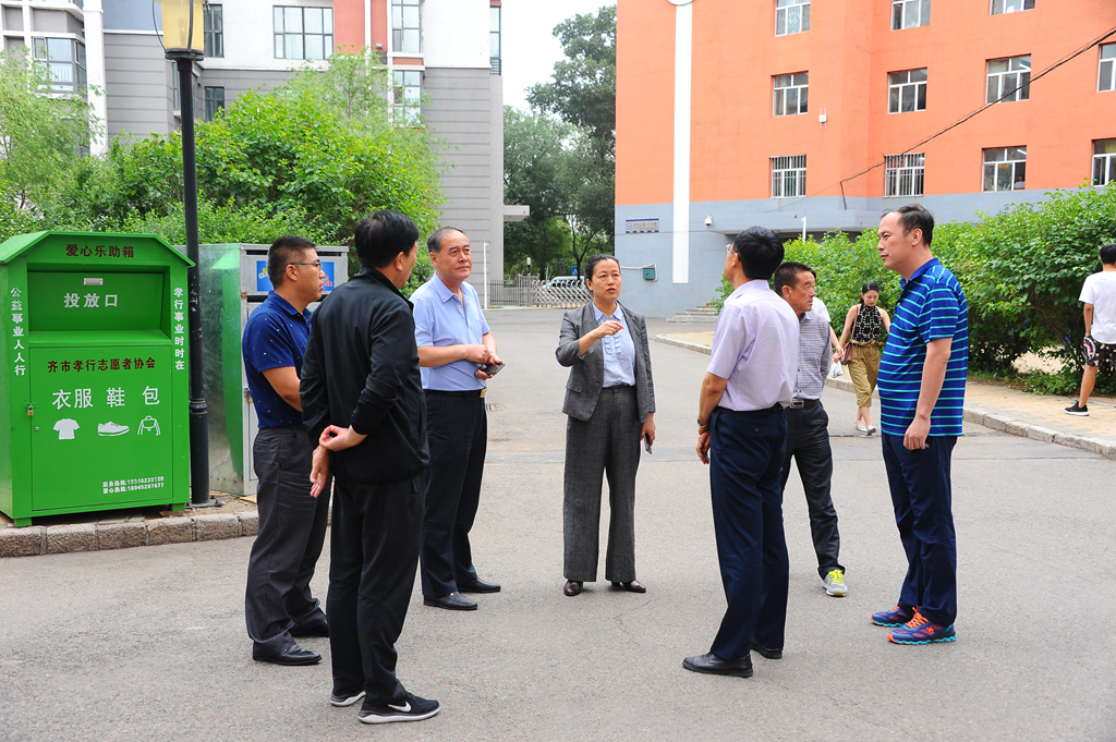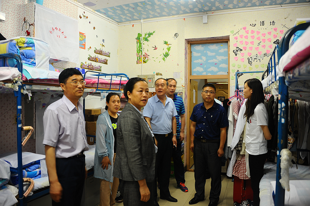 陈桂芝一行还先后来到学生宿舍7号楼和13号楼,实地查看了学生宿舍的情况。在建成时间较长、条件相对较差的7号宿舍楼,陈桂芝仔细查看学生的寝室、盥洗室和卫生间,详细询问了消防安全等保障措施,与宿舍管理员进行了交流。