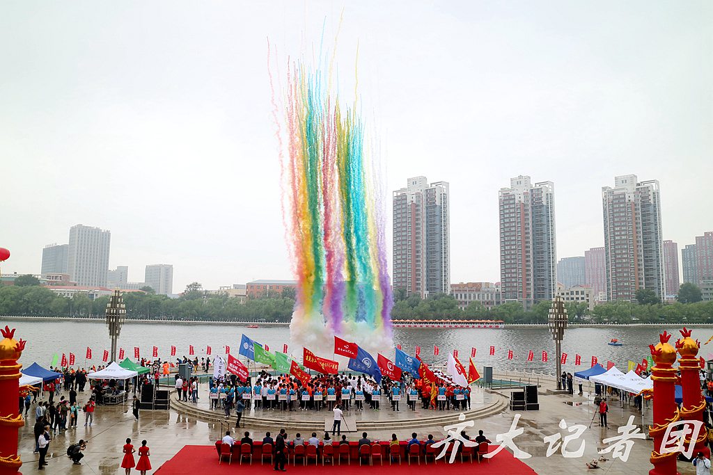 比赛开始后,随着发令枪响起,参赛龙舟瞬时竞发,犹如蛟龙出水,队员们在鼓点的引领和激励下快速整齐地挥动船桨,劈波斩浪,向终点冲刺,充分彰显了团结奋进新征程、奋勇书写中国梦的时代精神。