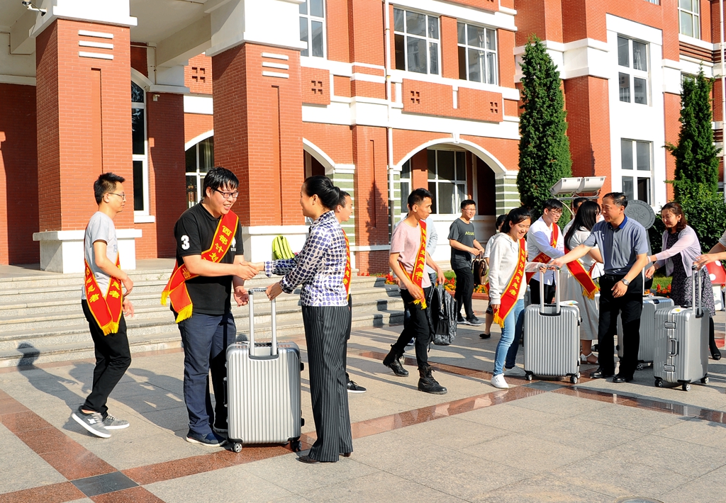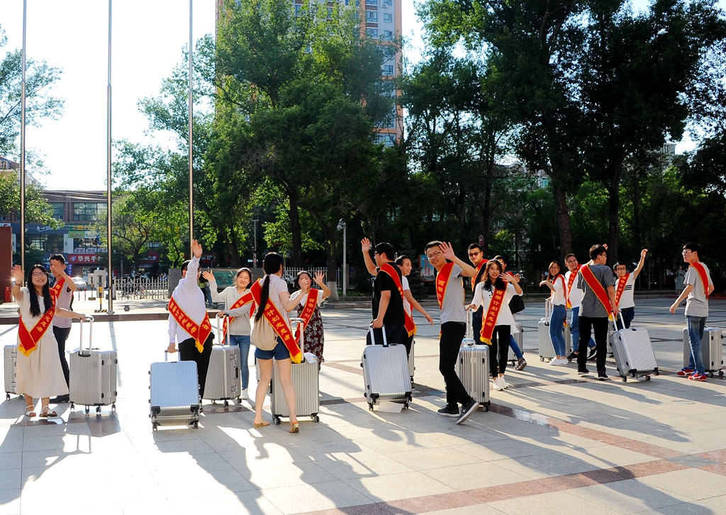 欢送仪式结束后,与会的领导、老师一同为2018年西部计划大学生志愿者披挂绶带、赠予箱包并合影留念。
