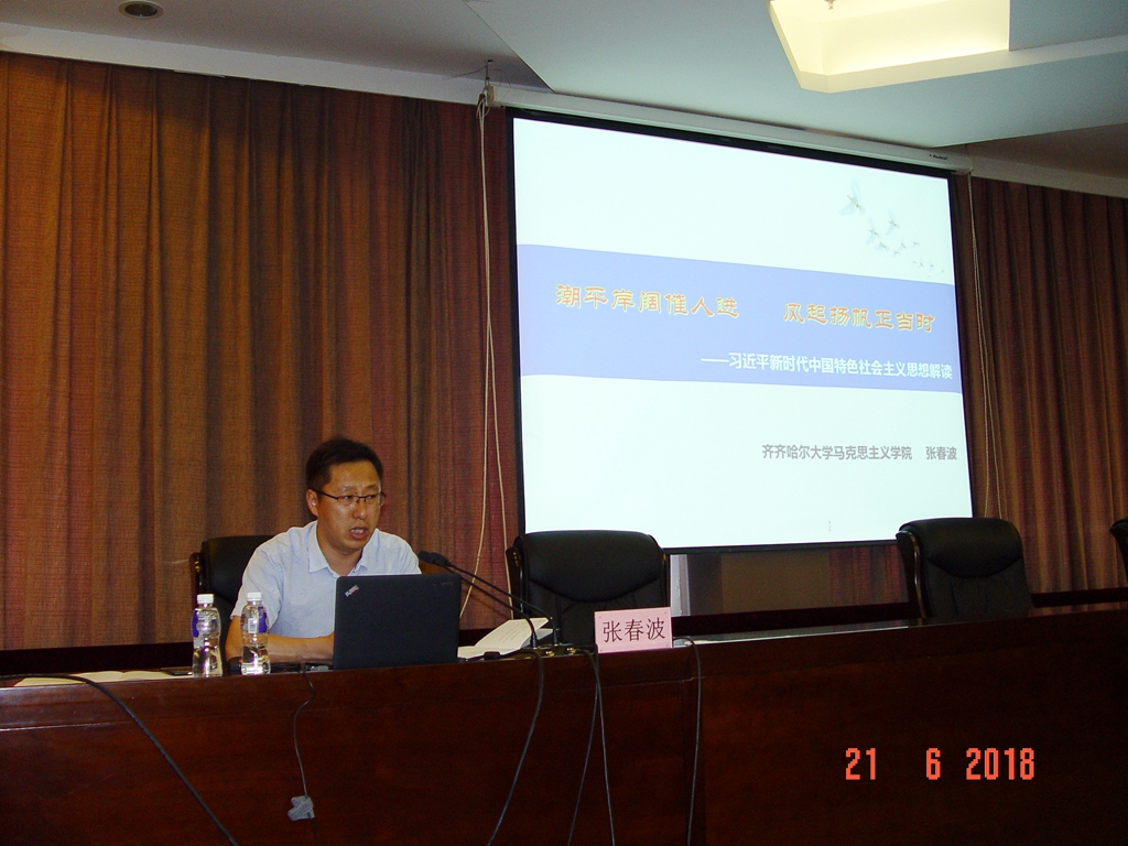 21日下午,sunbet申搏马克思主义学院中国近现代史基本问题教研部主任张春波副教授以《潮平岸阔催人进,风起扬帆正当时——习近平新时代中国特色社会主义思想解读》为题,从习近平新时代中国特色社会主义思想形成的条件、习近平新时代中国特色社会主义思想的深刻内涵、习近平新时代中国特色社会主义思想的时代价值、怎样学习和运用习近平新时代中国特色社会主义思想等四个部分,对习近平新时代中国特色社会主义思想的主要内容进行了深入解读。