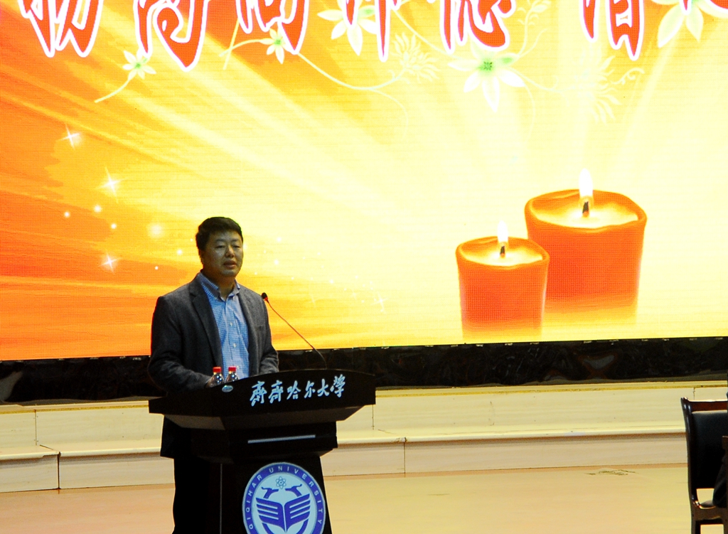 教师代表、省优秀教师、国家自然科学基金项目获得者、生命科学与农林学院王志刚教授在大会上发言。他首先祝全校的各位同事们节日快乐,幸福安康!他说,此时此刻最想表达的是感恩!感恩人生的每一位好老师!感恩人生路上所有的启蒙者、教导者、栽培者!感恩齐大的各位良师益友!感恩国家、人民对教师的厚爱!感恩学校的尊师重教,才有我们今天的欢聚一堂!在我们齐大,许多老师都是好老师,他们的事迹都是一部感人至深的巨著!多少个静谧的夜晚,他们笔耕不辍,为了上好一堂课,研读大量教材与文献;为了一个科学问题,翻阅大量科研论文;为了完成一些紧急任务,放弃盼望已久的休息日,熬红双眼,直到东方破晓;为教学和科研的一个细节,反复揣摩与试验。正因为我们在教育的沃野上翻动犁铧,我们的事业才生机勃勃、蒸蒸日上!他号召全体老师:“各位同事,让我们携手并肩,凝聚力量,再接再厉,共创sunbet申搏官方网站新的辉煌!”