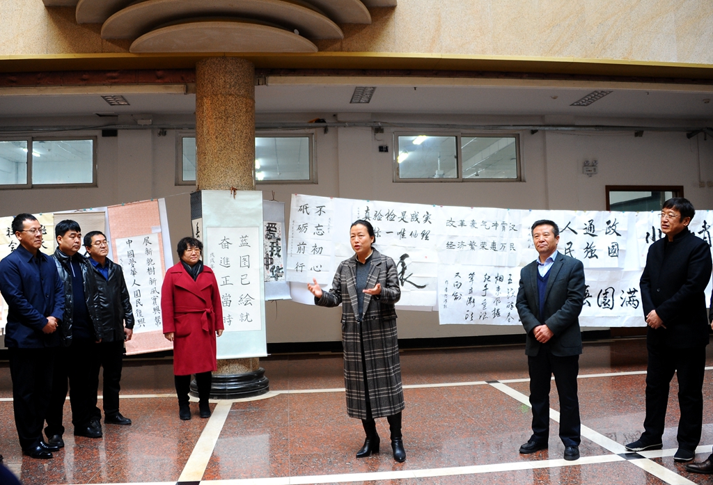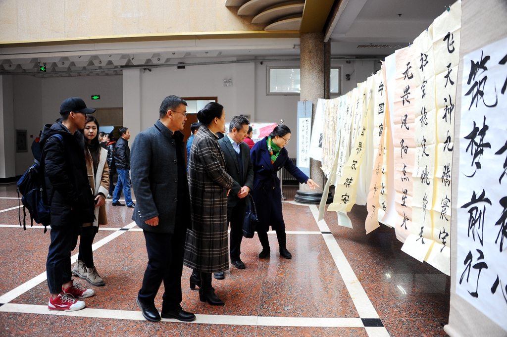 11月13日上午,校长陈桂芝、副校长李英杰到现场观看作品,学校各职能部门负责人、各二级党委(直属党支部)书记以及马克思主义学院全体教师、部分硕士研究生代表也来到现场一同观看了思政课学生作品展。