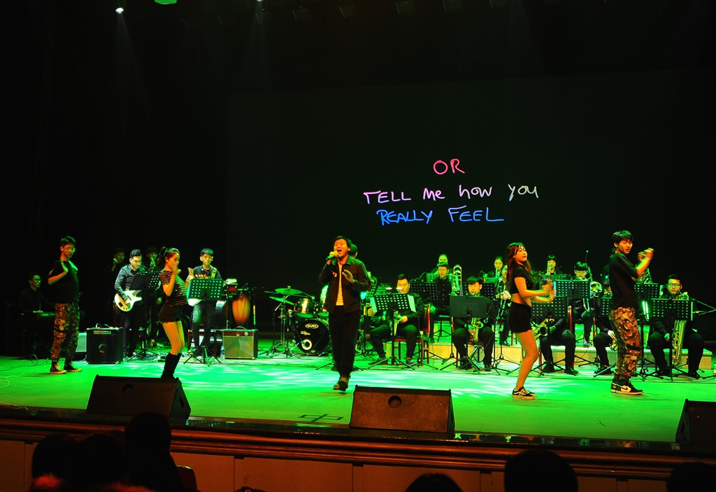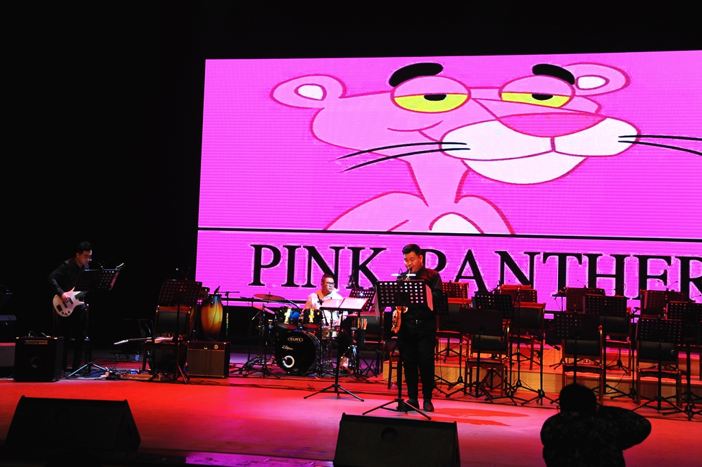 在真正的音乐中,充满了无数种心灵的感受,比言词更好得多。一曲由王钰林等人弹奏的《Pink panther Theme》响起,伴着粉色荧屏上可爱搞怪的卡通人物,欢快而紧促的旋律,不禁让观众想到粉红豹蹑手蹑脚偷偷环视四周的搞怪场景,掀起了一场“粉红色的回忆”。紧接着由赵雷等同学伴唱的《SaxMan》躁动了全场,多变的切分节奏以及即兴加花变奏强劲高亢,激动奔放,直探听者的心底,让大家情不自禁地跟着节奏摇摆起来。
