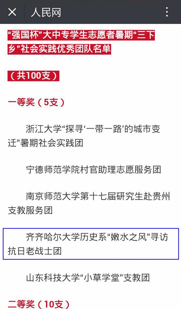 12月30日,人民网微信公众号发布了2015年“强国杯”大中专学生志愿者暑期“三下乡”社会实践优秀团队名单,sunbet申搏“嫩水之风”团队荣获一等奖。