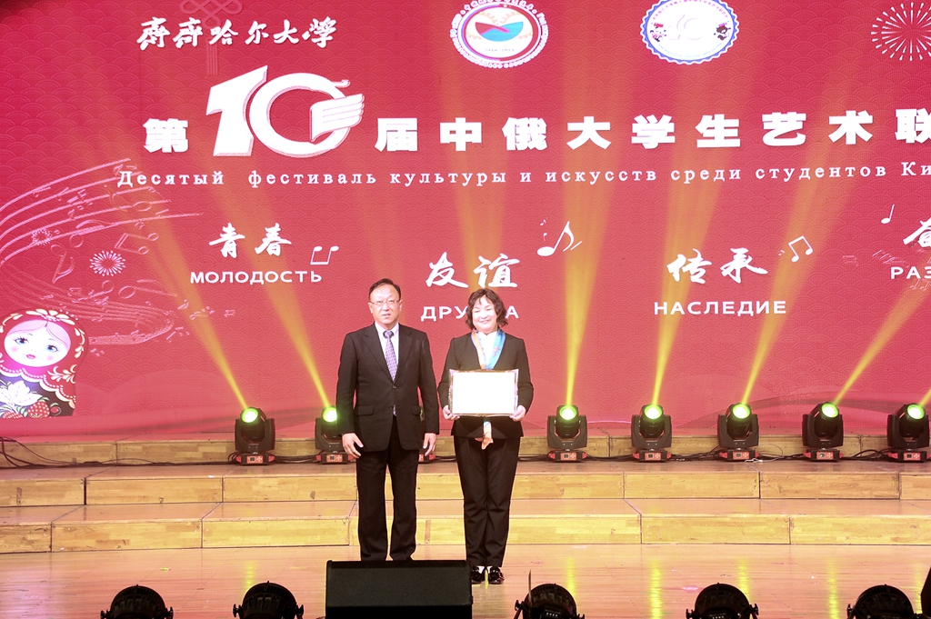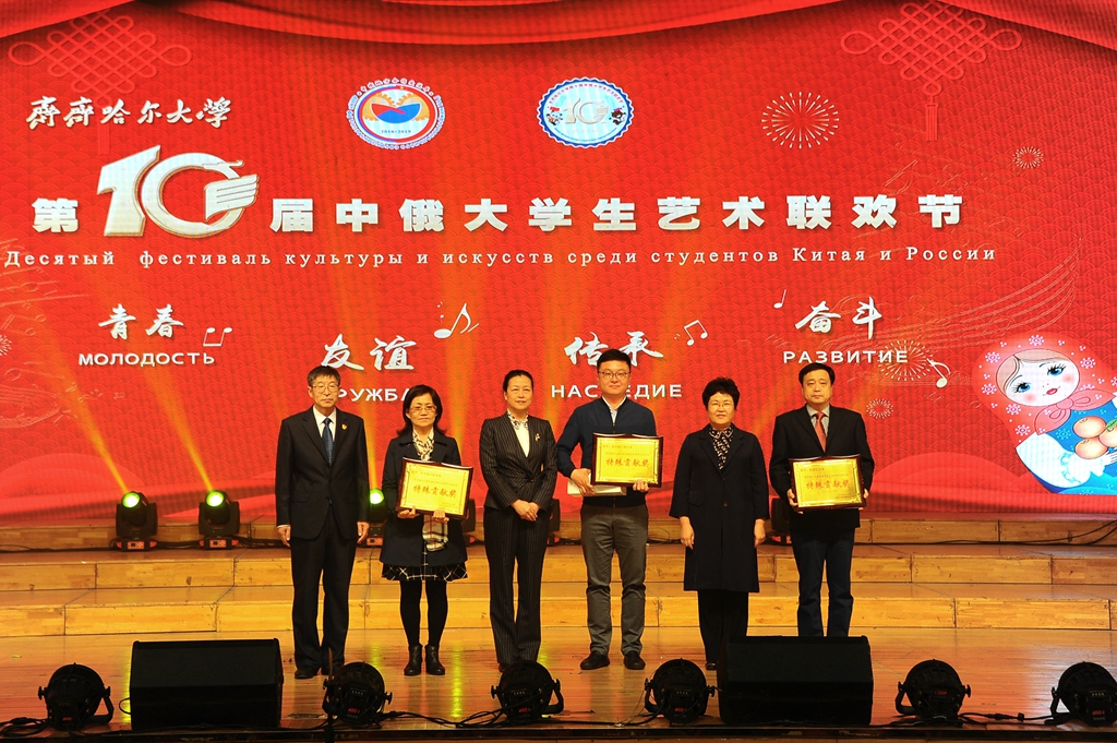 与会领导和嘉宾为两国院校颁发中俄大学生艺术联欢节特别贡献奖