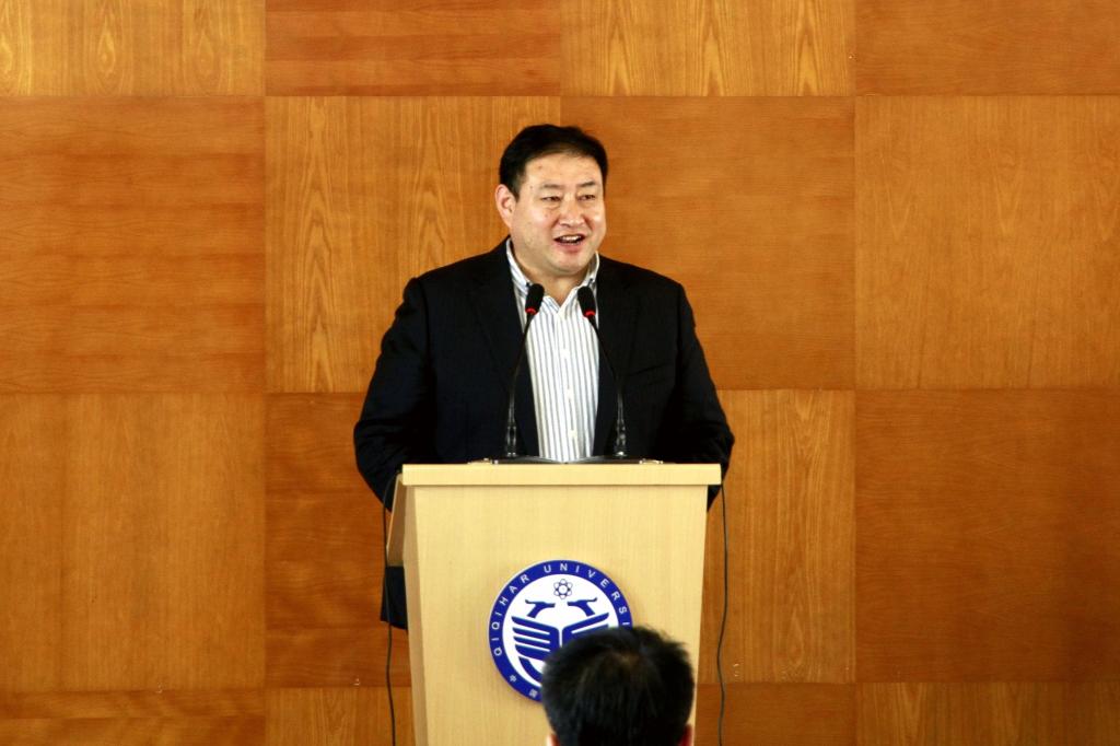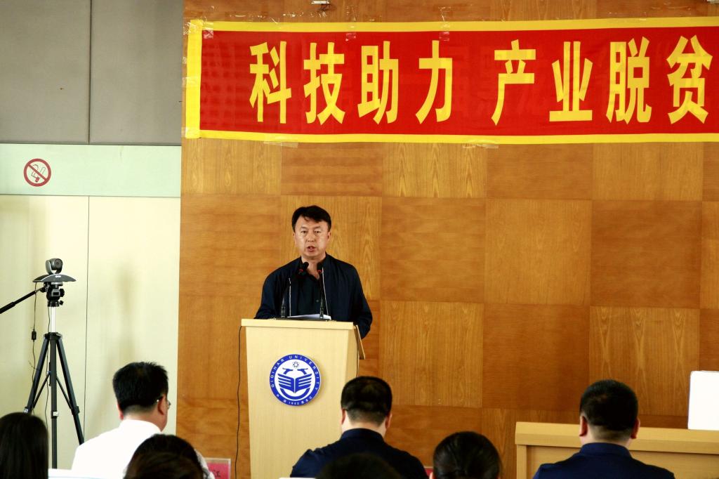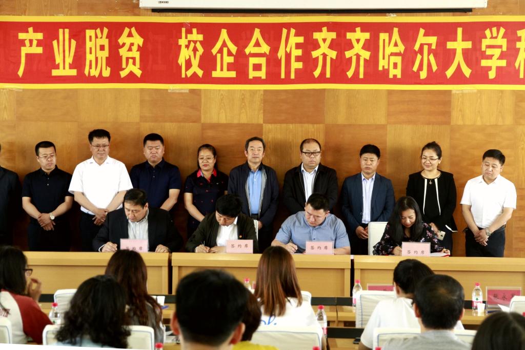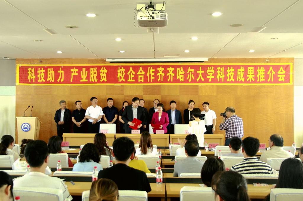 齐齐哈尔市政府副秘书长刘海涛,校党委常委、副校长吕厚均出席会议并见证了签约仪式,市科技局、团市委、富拉尔基区、克东县等主管领导,省林草局、团省委、龙江银行、团市委驻贫困村工作队,扶贫企业天锦公司、东惠农业科技公司、金思维网络公司负责人及部分贫困乡镇、村负责同志出席了推介会,会议由科研处长荆涛主持。