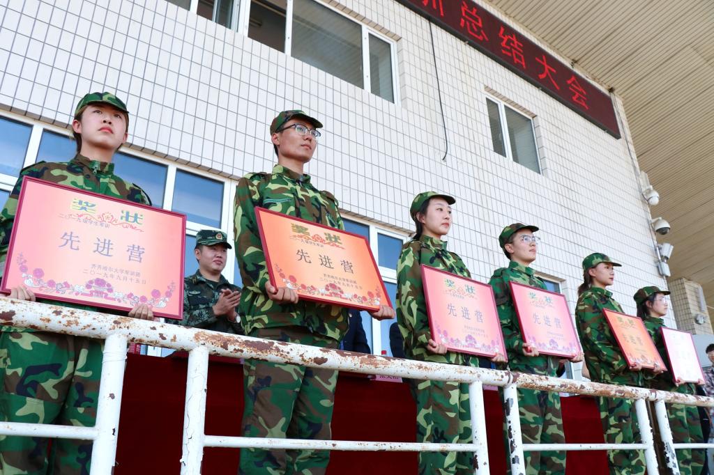校工会主席、军训团政委陶佰睿宣读了军训各奖项获奖名单。与会领导先后为此次军训工作中表现突出的先进营代表,组织奖、特殊贡献奖代表,先进连、队列汇操、内务卫生评比优胜连代表颁发了荣誉证书。