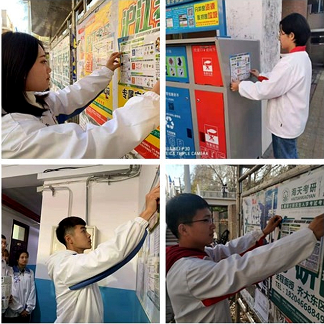 各学院志愿者在校园内寝室楼、及校园宣传栏张贴垃圾分类宣传海报,发放垃圾分类宣传单。