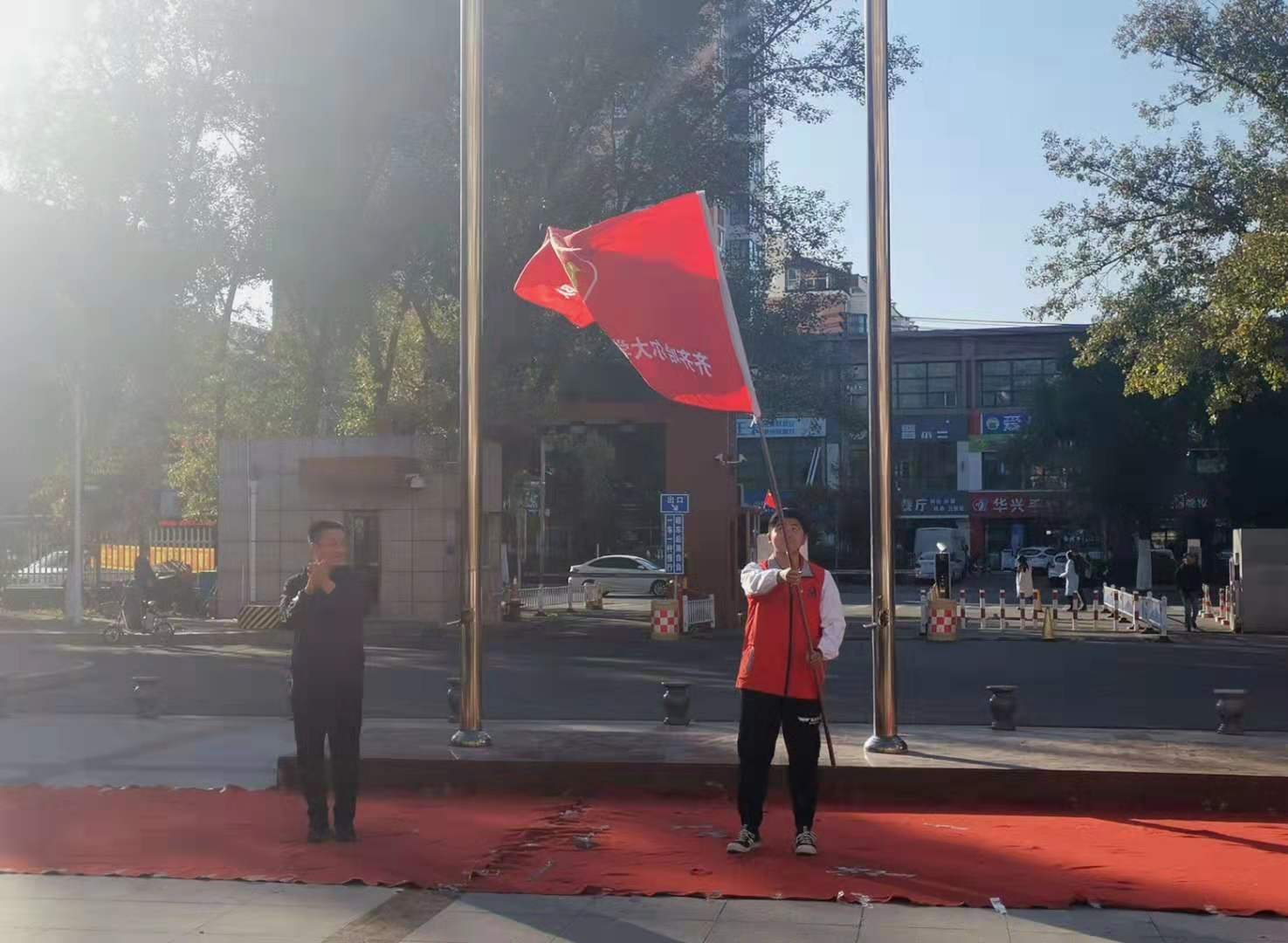 校团委书记孙大鹏为护河志愿服务队授旗,青年志愿者张金源代表护河志愿服务队接旗。