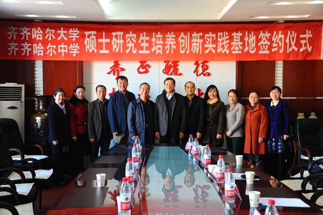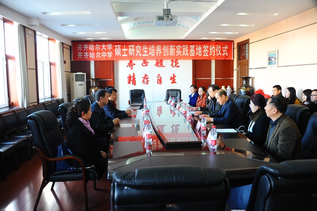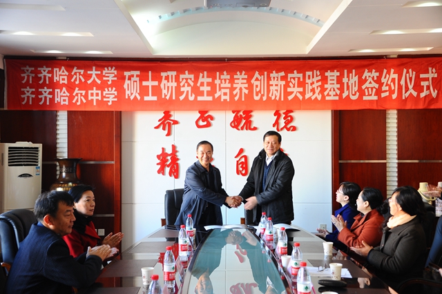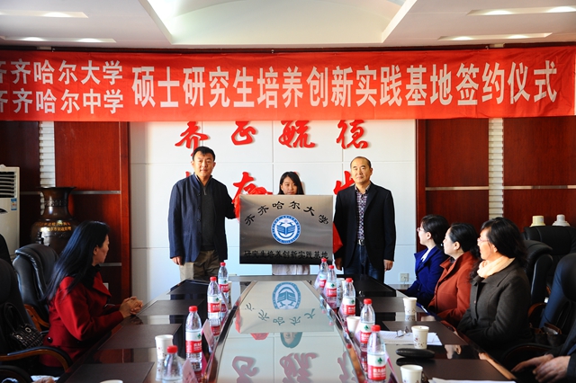 仪式上,校党委常委、副校长邓启刚与齐齐哈尔中学校长许凯代表两校签订了研究生培养创新实践基地共建协议。校研究生部主任刘喜军、齐齐哈尔中学党委书记孙浩共同为基地揭牌。