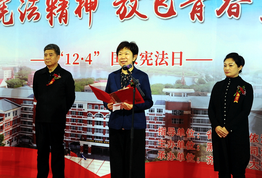 何晶在致辞中说,近年来,在省委、省政府和省级各部门的坚强领导下,齐齐哈尔市委、市政府坚持围绕中心,服务大局,以法律“七进”为载体,开展了卓有成效的普法宣传教育活动,取得了一定成绩。本次高校法治文化节将通过校园法治作品展、宪法宣传短片及法治文艺演出等形式全方位的展现齐齐哈尔市和sunbet申搏官方网站在法治文化建设、“谁执法谁普法”普法责任制实施、“七五”普法规划落实等方面的工作成果。希望借这次活动的东风,再次掀起崇尚宪法、学习宪法、遵守宪法、维护宪法、运用宪法的新热潮,推动宪法扎根社会、惠及百姓,为实现全面依法治国贡献力量!