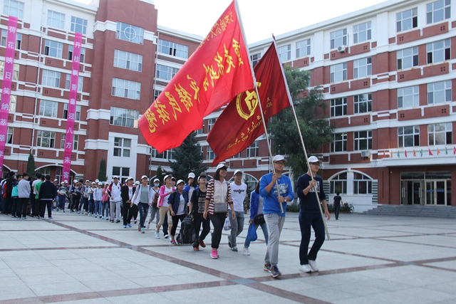 7:20,sunbet申搏由100名师生组成的徒步队伍在旗手的引导下踏上征程,从中区广场出发,徒步经广播电视大学、新明大街、锦绣家园、永安大街、永安立交桥,行至大民镇。