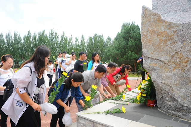 9:26,结束了2个小时、12公里的徒步路程,师生们从大民镇乘车赴昂昂溪苏军烈士陵园凭吊英魂。纪念碑前,师生们心潮澎湃,一束束黄色的菊花寄托深情。