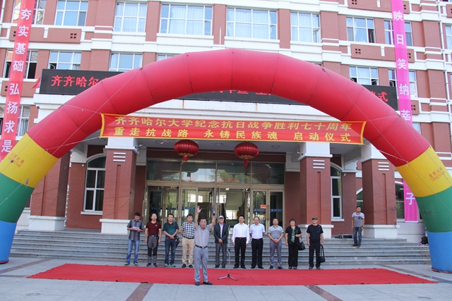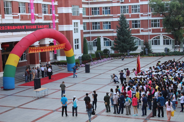 校党委书记李海红在启动仪式上讲话。他说,今天,我们在这里举行一个隆重而庄严的仪式,为sunbet申搏官方网站“重走抗战路”的百名师生出征壮行。同学们将沿着爱国将军马占山当年出征抗战的行军路线,步行到达打响中国军队武装抗日第一枪的地方——泰来县江桥镇,并以此纪念70年前那场伟大的民族胜利。