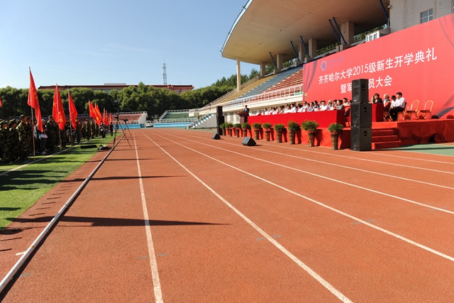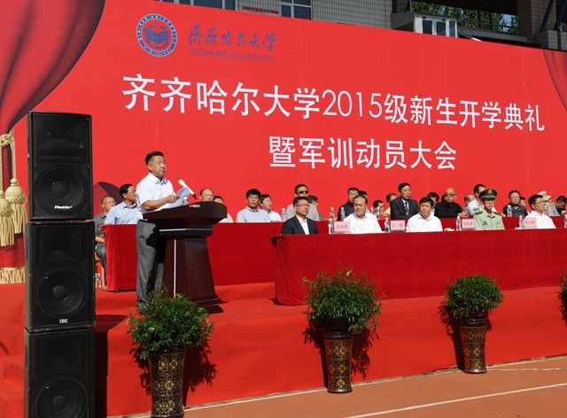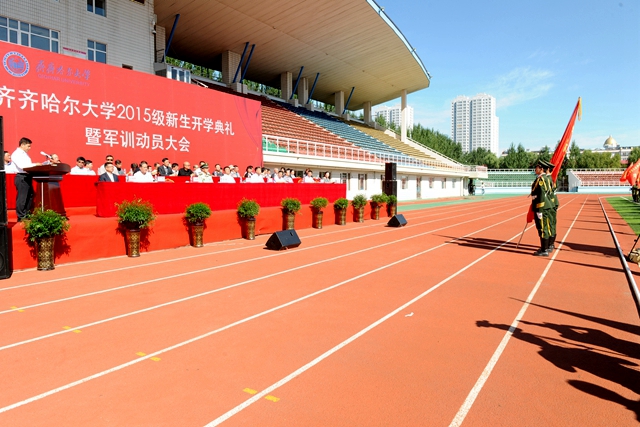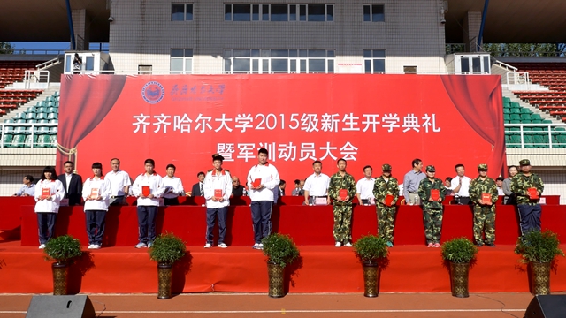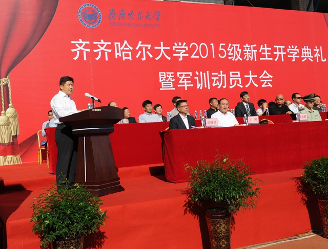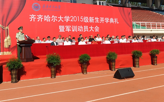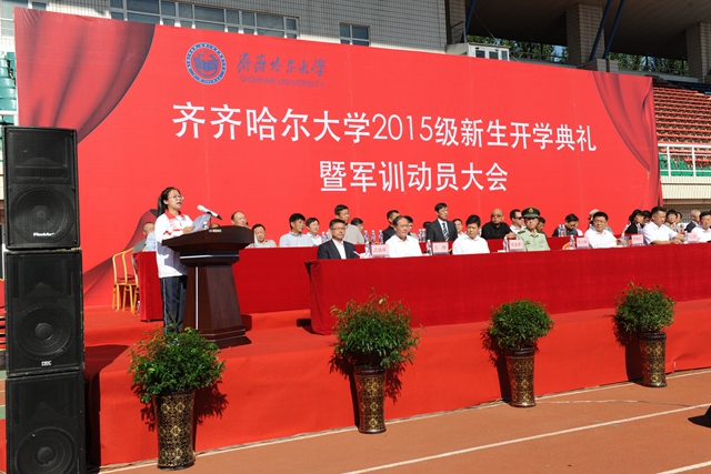 校党委书记李海红,校长马立群同志,校党委副书记盖元臣,常务副校长郑喜群,副校长邓启刚、王刚、李英杰,党委常委、组织部部长齐宏伟,承训部队首长、武警齐齐哈尔支队副参谋长矫占峰中校,特邀嘉宾,sunbet申搏优秀校友代表、工业分析专业八八届毕业生、大庆油田勘探开发研究院总工程师、北京奥运会火炬手、全国“五一”劳动奖章获得者、全国劳动模范伍晓林等出席典礼并在主席台前排就坐。各学院院长、党委书记、军训团组成单位领导,来自全国各地的2015级新同学(本科生、研究生)参加了开学典礼。