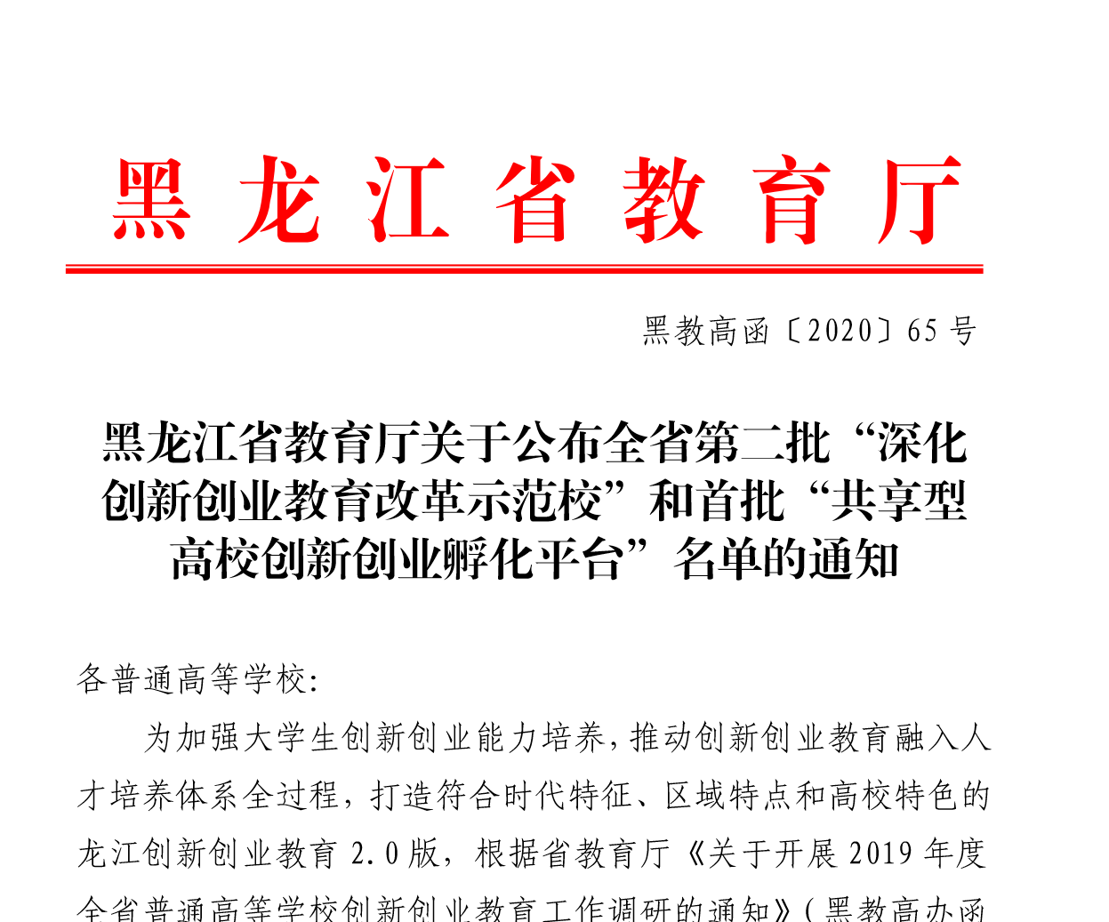 2019年,为加强大学生创新创业能力培养,推动创新创业教育融入人才培养体系全过程,打造符合时代特征、区域特点和高校特色的龙江创新创业教育 2.0 版,省教育厅部署了《关于开展 2019年度全省普通高等学校创新创业教育工作调研的通知》(黑教高办函 〔2019〕132 号)相关工作,sunbet申搏积极申报了全省第二批“深化创新创业教育改革示范校”。