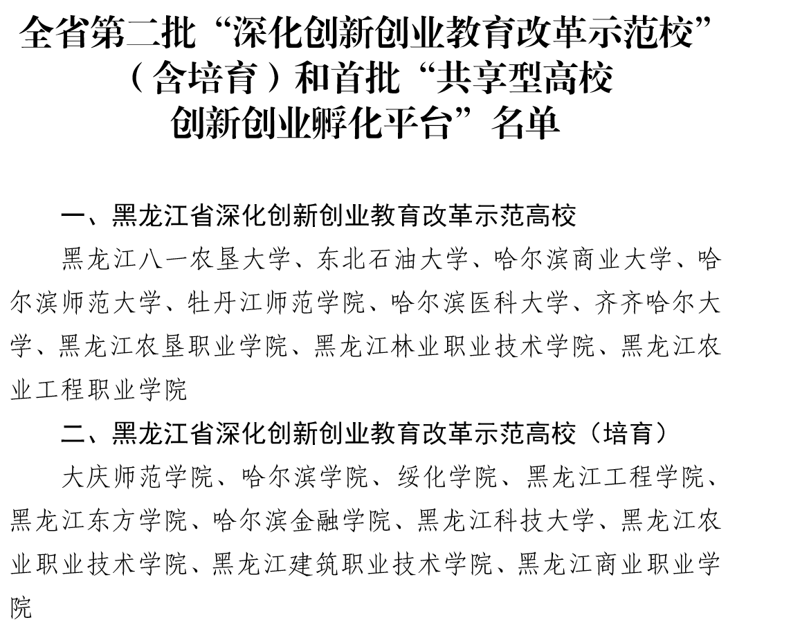 3月17日,黑龙江省教育厅公布了全省第二批“深化创新创业教育改革示范校”和首批“共享型高校创新创业孵化平台”名单,sunbet申搏被认定为黑龙江省第二批“深化创新创业教育改革示范校”,这一荣誉的获得标志着sunbet申搏官方网站大学生创新创业教育工作迈上新台阶。