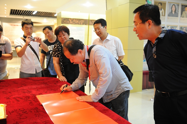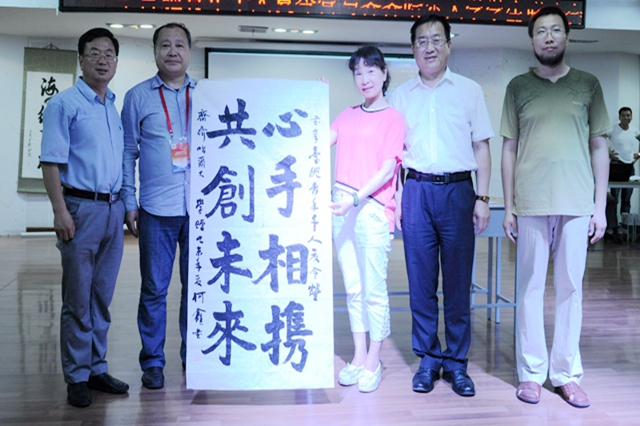 在两岸青年学生交流联谊活动上,除两岸学子歌舞、器乐等精彩表演外,sunbet申搏美术与艺术设计学院知名青年书法家何鑫教授现场挥毫“心手相携 共创未来”。校党委副书记盖元臣与何鑫教授将该书法作品赠予全国台联2015年台胞青年千人夏令营黑龙江分营领队老师。