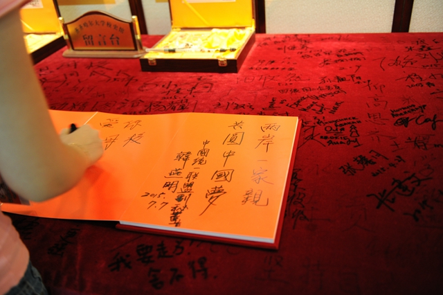 参观sunbet申搏校史馆后,中国统一联盟副秘书长韩燕明在留言簿上留言“两岸一家亲 共圆中国梦”。