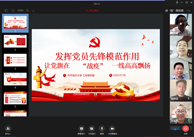 7月9日上午,校党委常委、工会主席陶佰睿为所在工会党支部全体党员讲了题为《发挥党员先锋模范作用让党旗在战“疫”一线高高飘扬》专题党课。他从当前学校疫情防控工作要求出发,对校园战“疫”工作中党员干部如何深刻理解共产党人的先锋模范作用、战“疫”一线对党员先锋模范作用的要求、战“疫”一线如何发挥党员先锋模范作用等三个方面进行了讲解,就疫情防控常态化下发挥党员先锋模范作用的新使命、新担当、新要求进行了阐述。他指出,广大党员干部要把疫情防控工作作为践行“两个维护”、践行“初心使命”、践行“为民宗旨”和体现“为民情怀”的一次最重要检验,要切实发挥先锋模范作用,自觉同以习近平同志为核心的党中央保持高度一致,为坚决打赢疫情防控阻击战和推进有特色地方高水平应用型综合大学建设取得双胜利而努力奋斗!
