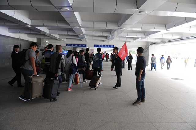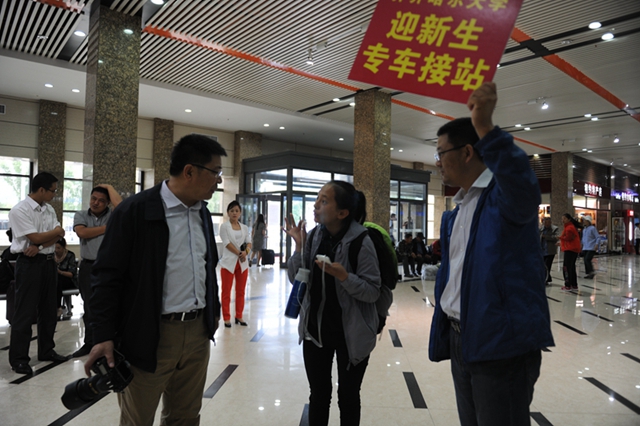 学校在火车站设立了迎新接站工作点,提供免费的接站专车。现场工作的有关领导、老师、学生社团志愿者们打着引导牌、挥舞着旗帜,积极有序地迎接刚刚走下火车的新生同学及家长,组织大家及时坐上接站班车,顺利抵达学校。
