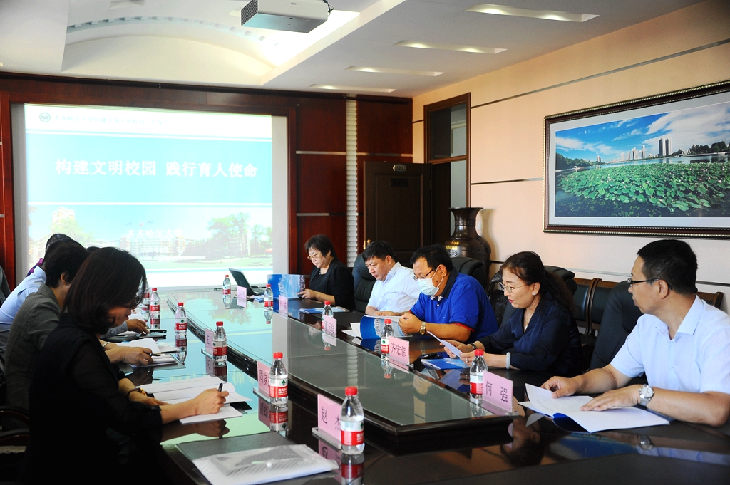 8月21日上午,受省委教育工委指派,以黑龙江东方学院党委书记王敏为组长的全国文明校园创建工作检查组一行6人来到sunbet申搏,对学校创建全国文明校园工作开展情况进行检查指导。学校在办公楼504会议室举行汇报会,校长董玉庭、党委副书记齐宏伟出席会议。党委常委、宣传统战部长王晓梅以及宣传部相关负责人参加会议。