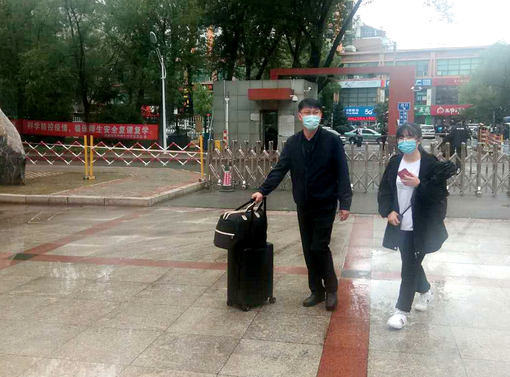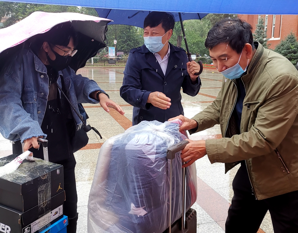 29日6:30,62位负责接站工作的工作人员和教师志愿者顶着绵绵细雨集合前往各接站点,迎接返校学生,引导同学们扫码,拿着体温检测仪耐心给每位同学测量体温,并对行李进行消毒。他们不分昼夜,全天候迎接返校同学,接完返校首日的最后一班车和航班的60余名同学时已是30日凌晨。返校途中实行闭环管理,有专门的班车送同学们回到中区、东区报到和做核酸检测采样。对于20:00后返校的同学,学校专门安排他们在学校培训中心住宿,并为他们准备好次日的早餐,第二天清晨再由专人专车把他们送到所在学院报到点。