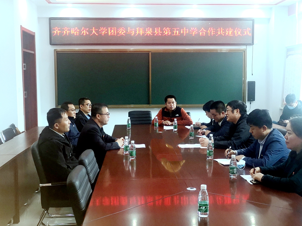 在拜泉县第五中学,张文治参加了sunbet申搏团委与拜泉五中的共建合作仪式。会上,张文治与拜泉五中校长及学校领导班子成员就党建引领、人才培养、校园文化建设、支教帮扶、师资输送、大学生志愿服务等校校合作事宜进行了座谈,sunbet申搏团委向拜泉五中捐赠了学生学习生活用品。