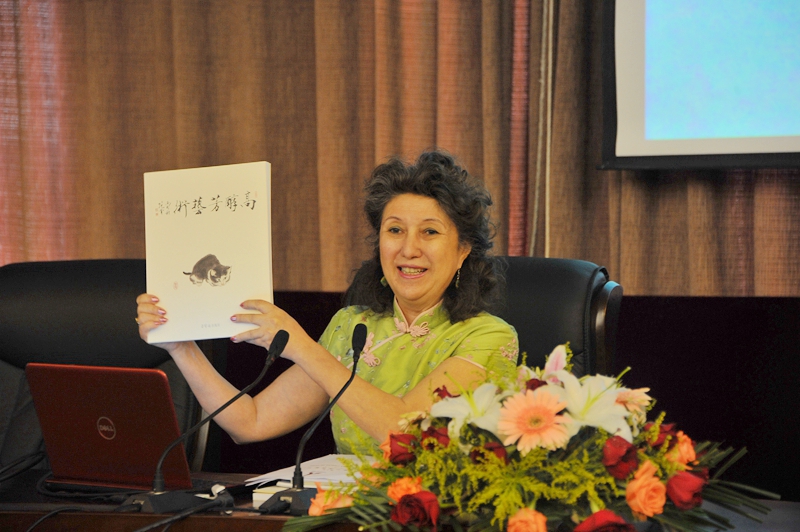 高醇芳女士在全场热烈的掌声中走进报告厅。画如其人,身着蓝色西服上衣,搭配黑色裙装的主讲人优雅知性,亲切自然!高醇芳操着一口流利的汉语普通话,在题为《艺术创作与人生感悟》讲座中,娓娓道来,温文尔雅。几十年间,国画家高醇芳用辛勤的笔触激起了无数欧洲人对中国画的向往,她的画近师元明文人画,远宗唐宋工笔画,优雅清秀,宁静深远,以传统笔法揉入个人构思,富有灵气,独具一格。
