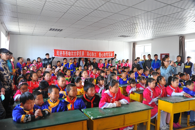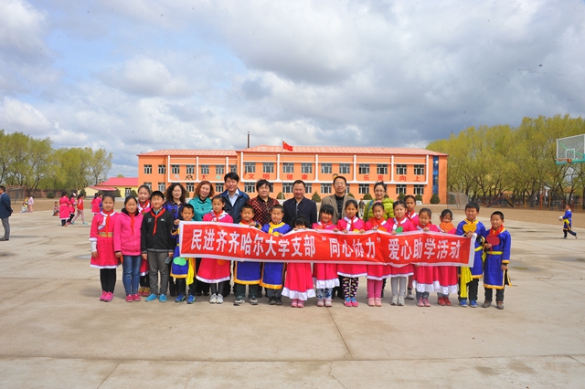 5月6日,在中国共产主义青年团建团94周年、“五四”运动96周年之际,“鸿雁工程”以十八年的厚重积淀迎来了又一年的春暖花开。齐大师生一行三十余人赴梅里斯区哈拉达族小学开展了“大手牵小手·共圆‘中国梦’”同心协力捐资助学活动。sunbet申搏官方网站宣传部、统战部部长王晓梅,中国民主促进会齐齐哈尔市委副秘书长秉德新,食品学院党委书记杨淳,哲法学院副院长、sunbet申搏官方网站民进支部主委苗绘,食品学院院长裴世春,党委宣传部副部长何强,学生工作部(处)副处长张树启,食品学院副书记、副院长赵振华,食品学院团委书记李海明及食品学院“鸿雁工程”志愿服务队的同学们加了本次活动。