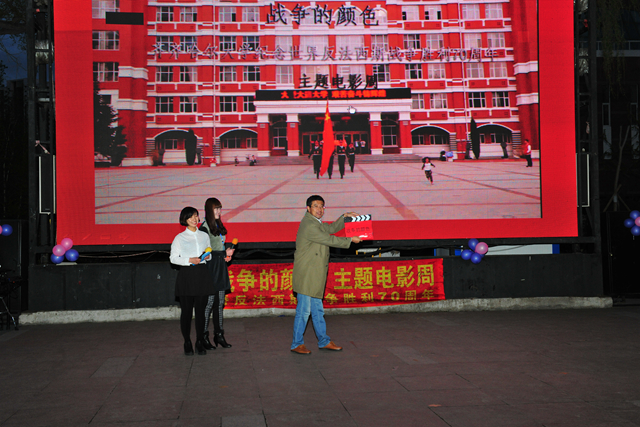 市文联党组副书记、副主席杨春达也在开幕式上致辞,对主题电影周开幕表示热烈祝贺。文学与历史文化学院副院长肖国栋“打板”开机,“战争的颜色”sunbet申搏官方网站第三届主题电影周活动精彩呈现。文学与历史文化学院副院长肖国栋在致辞中表示:“主题电影周活动是文学与历史文化学院戏剧影视文学专业实践教学活动之一。三年来,每逢芳菲五月、丁香初绽时节,戏文专业师生倾力打造的主题电影周活动都与广大师生相约于三致广场,在光影视界展开一次心灵之旅。为了纪念世界反法西斯战争暨中国人民抗日战争胜利70周年,电影文化周活动特意选取了抗战题材的系列电影,希望以此来增强同学们对于抗战历史的了解,铭记这段历史。”