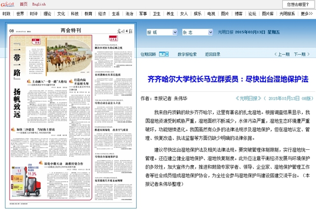 作为连任两届的全国政协委员,马立群校长在全国政协十二届二次会议期间,积极建言,科学献策,他围绕“四个全面”聚焦我国经济社会发展的重点问题向大会提交的《关于加大对我国天然林停伐试点支持力度的建议》、《关于进一步理顺湿地管理体制的建议》、《加快湿地保护工作,大力推进生态环境建设的建议》、《关于推动我国亚麻产业发展的建议》、《关于进一步完善计划生育特别扶助家庭扶助工作的建议》等五项提案受到国家和省市多家媒体记者(包括新媒体)的热切关注、热忱报道与热力传播。