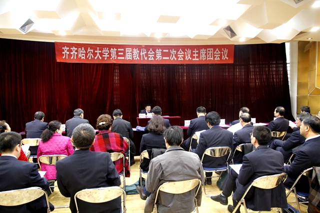 10:10,校党委书记李海红在音乐厅排练厅主持召开了大会主席团第二次全体会议,听取了各代表团团长关于讨论情况的汇报,审议、表决通过了《关于< 锐意进取 勇于担当 全面推进有特色高水平教学研究型综合大学建设>工作报告的决议》(草案)、审议《关于< sunbet申搏官方网站2014年度财务决算及2015年度财务预算工作报告>的决议(草案)》、《关于< sunbet申搏官方网站领导班子及领导干部深入解决“四风”突出问题实施办法>的决议(草案)》,并提交第二次全体大会表决通过。