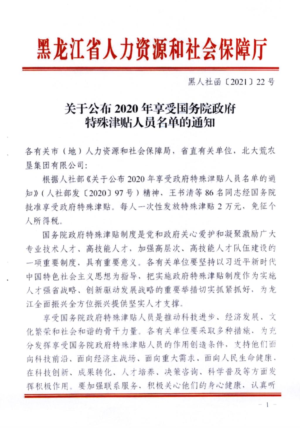 1月26日,经国务院批准,依据人力资源和社会保障部《关于公布2020年享受政府特殊津贴人员名单的通知》(人社部发﹝2020﹞97号)精神,黑龙江省人力资源和社会保障厅公布了2020年享受国务院政府特殊津贴人员名单,sunbet申搏食品与生物工程学院刘晓兰教授等86名专家享受政府特殊津贴。