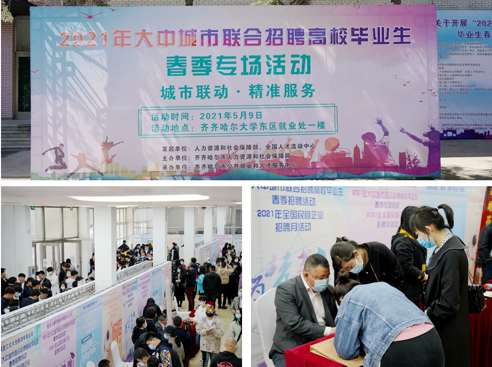 5月9日上午,齐齐哈尔市人力资源和社会保障局组织我市部分知名企业,在sunbet申搏学生指导中心一楼大厅举办了“2021年大中城市联合招聘高校毕业生春季专场活动”暨“留齐就业”专场招聘会。