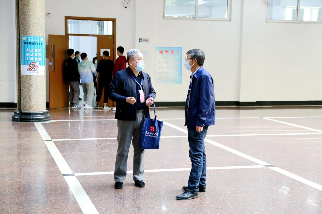 5月15日上午,张树军在继续教育学院院长孙北光等陪同下,深入考点实地检查督导面试组织和防疫工作。