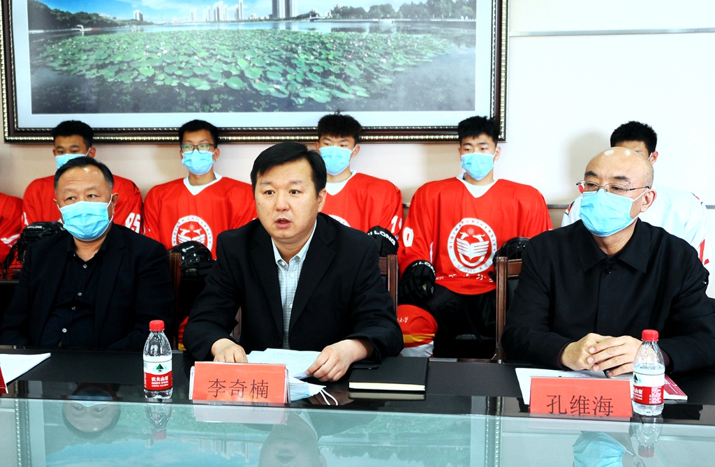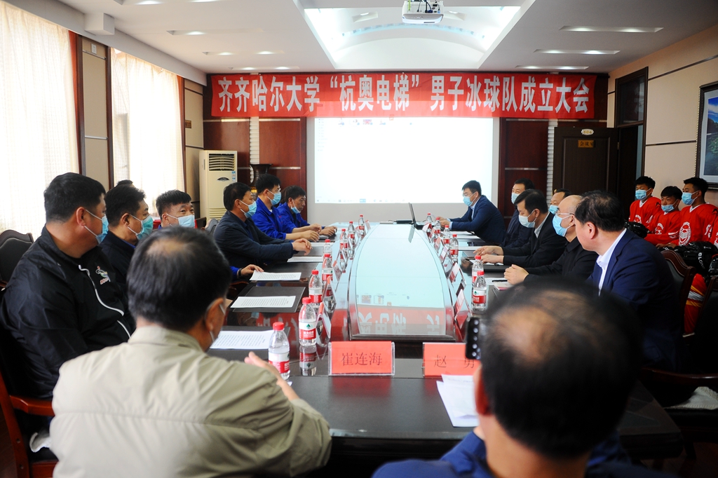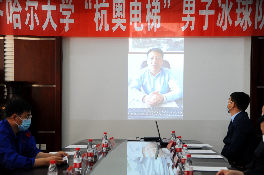 齐齐哈尔市杭奥电梯有限公司相关负责人,sunbet申搏党委统战部部长孔维海和体育学院党政领导班子成员以及各系部负责人、sunbet申搏冰球队队员参加了会议。
