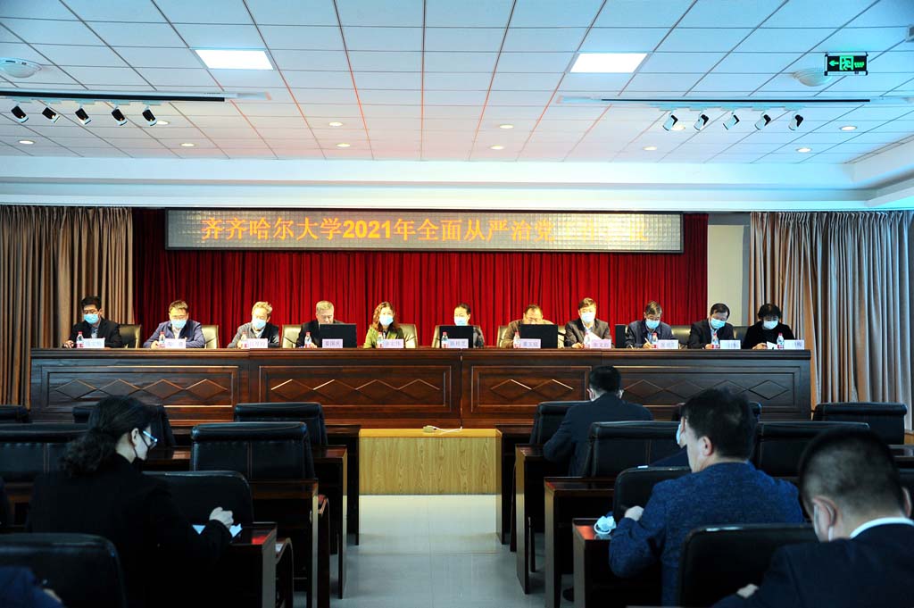 她代表学校党委就做好2021年学校全面从严治党工作从六个方面进行全面部署:一要突出政治引领,坚决做到“两个维护”。强化政治领导,坚持和加强党对学校工作的全面领导。突出政治监督,加强对党史学习教育、疫情防控、民主生活会等开展政治监督。启动校内巡察工作,推动全面从严治党向二级党组织有效延伸。二要强化党的创新理论武装,拧紧理想信念总开关。从严从实抓好党史学习教育,奋力谱写齐大高质量发展新篇章。全力把牢意识形态阵地,加强“三微一端”等网络阵地建设和管理,守牢网络舆情底线。三要加强党的组织建设,着力打造高素质干部队伍。严抓基层党建工作,指导二级党组织做好换届选举工作,以严肃的纪律确保换届风清气正。建设忠诚干净担当的高素质干部队伍,严格干部选任程序和日常管理监督,强化纪律教育和事前监督。四要锲而不舍深化作风建设,持续开展纠“四风”树新风。开展深化作风整顿优化育人环境工作,持续抓好落实中央八项规定及其实施细则精神的监督,毫不松懈纠治“四风”。加大对违反师德师风问题的惩处力度,以高压态势依规依纪严肃惩治师德失范问题。五要坚持标本兼治,一体推进不敢腐、不能腐、不想腐。强化“不敢腐”的震慑,始终保持惩治腐败高压态势。扎紧“不能腐”的笼子,推进廉政风险防控体系建设。增强“不想腐”的自觉,努力营造崇廉尚洁文化氛围。六要压实管党治党政治责任,推进全面从严治党任务落实落靠。全面落实主体责任,党组织书记要扛起“第一责任人”责任,班子的其他成员要履行“一岗双责”责任。切实强化监督责任,学校纪检监察机构要认真履行监督基本职责、第一职责,纪检监察干部要自觉做到忠诚干净担当。