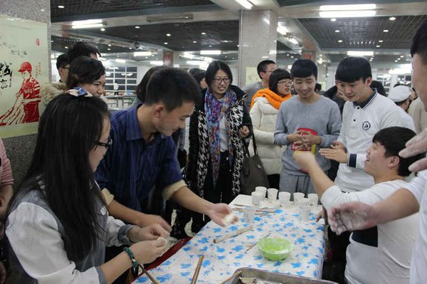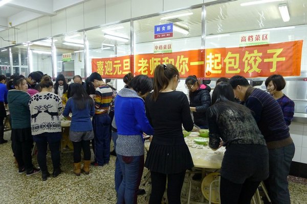 2014年12月31日晚,学校中区和东区食堂内欢声笑语、暖意融融,学生工作部组织的“我们一起包饺子”迎新年活动正在这里进行。