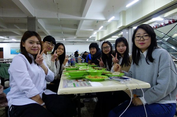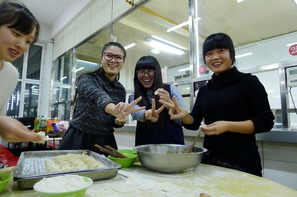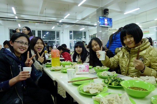 在东区食堂,记者还看到了11号宿舍楼725寝室的七个女生围坐在一起吃着自己包的饺子,记者问她们,你们怎么没去外面的饭店吃饭呢?她们回答:在学校的食堂,我们自己包饺子吃,更有家的感觉,我们觉得就像在家过节一样。