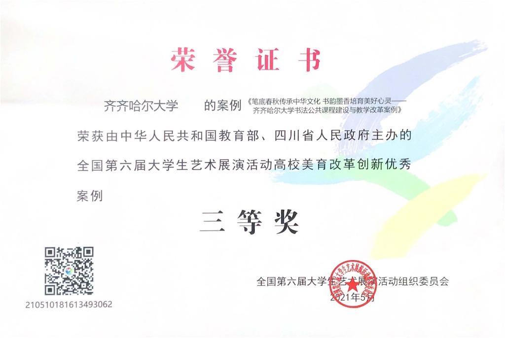 赵忠山、许海洋的作品《笔底春秋传承中华文化 书韵墨香培育美好心灵——sunbet申搏官方网站书法公共课程建设与教学改革案例》,荣获全国第六届大学生艺术展演优秀案例三等奖。