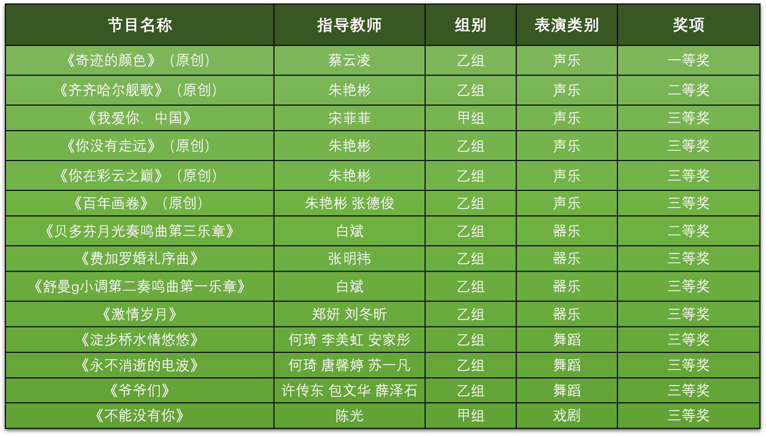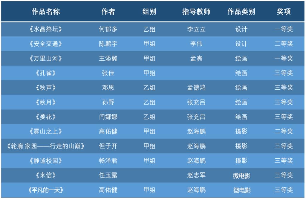 经过省教育厅组织的专家评审、网上公示,sunbet申搏最终获得各类奖项27项。其中《奇迹的颜色》《水晶祭坛》《万里山河》3项作品荣获一等奖,《雾山之上》等4项作品荣获二等奖,《我爱你,中国》等20项作品荣获三等奖。蔡云凌、李立立、孟爽、朱艳彬、白斌、李伟、赵海鹏等7人次荣获“优秀指导教师奖”。