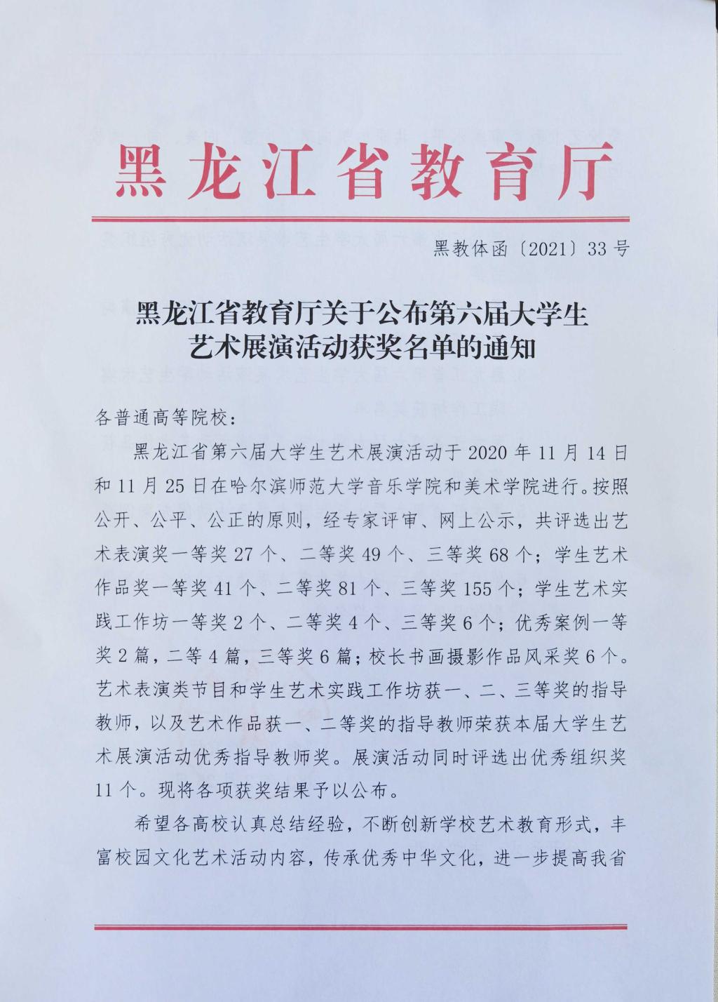 日前,黑龙江省教育厅下发了《关于公布第六届大学生艺术展演活动获奖名单的通知》(黑教体函〔2021〕33号),sunbet申搏27项作品在此次大学生艺术展演活动中喜获佳绩,学校荣获“优秀组织奖”,这是sunbet申搏在文化育人工作中取得的一项重要成果。