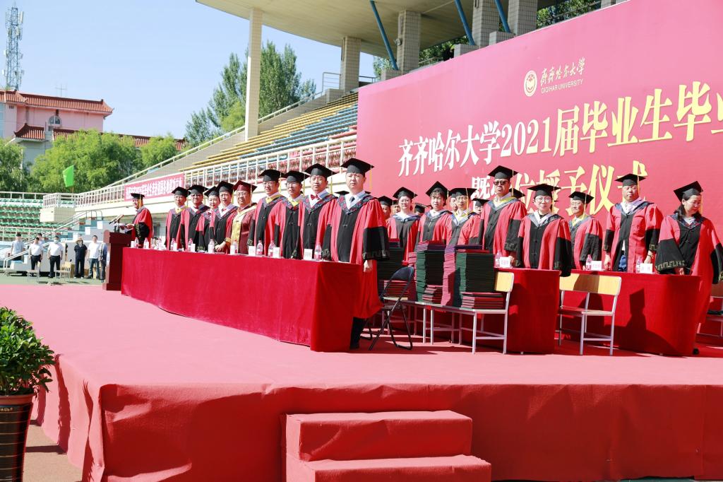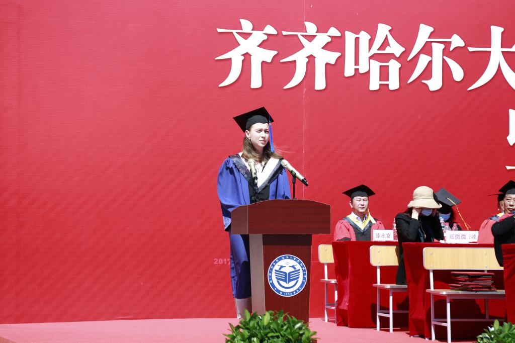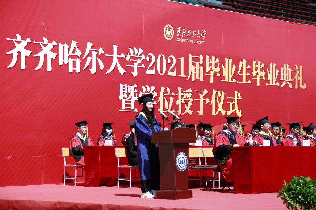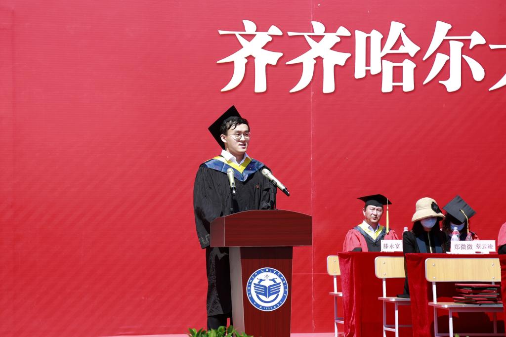 毕业留学生代表娜斯佳、硕士毕业生代表袁倩宇、本科毕业生代表李鹏喆先后在典礼上发言,他们深情地表达了对母校的感恩和不舍,对老师、同学的感激和祝福,并表示,作为齐大学子,一定会秉承“养正毓德 精存自生”的校训精神,积极进取、努力拼搏,用自己的所学所能回馈社会、回报母校。