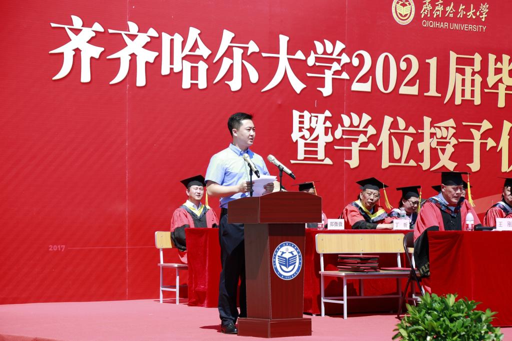 校友代表、哈尔滨儿童制药厂董事长、哈尔滨凯程制药有限公司总经理、黑龙江省中医药研究促进会副会长郑微微在典礼上发表讲话,她代表全体校友对母校的培养和教育表示感谢,对学弟学妹们顺利地完成了学业表示祝贺。希望学弟学妹们在将来的工作中能够保持勤奋乐观、不怕辛劳的态度,一要做到有责任,有担当,不仅要好好工作、努力生活,更要有赤子之心、凌云之志和家国情怀。二要做到勤奋踏实,只有持续不断的投入,才会有所收获。三要做到有规划,有执行力,因为机会永远是留给有准备的人。最后,她祝愿母校越办越好,祝愿齐大校友事业有成,祝愿全体齐大亲人生活更幸福!