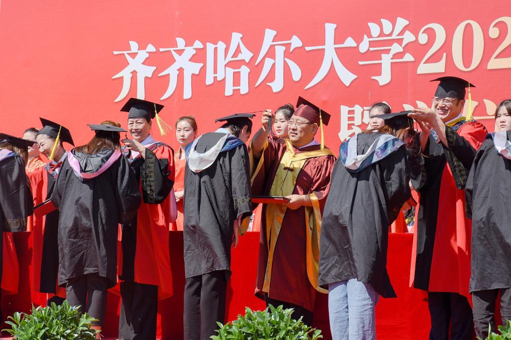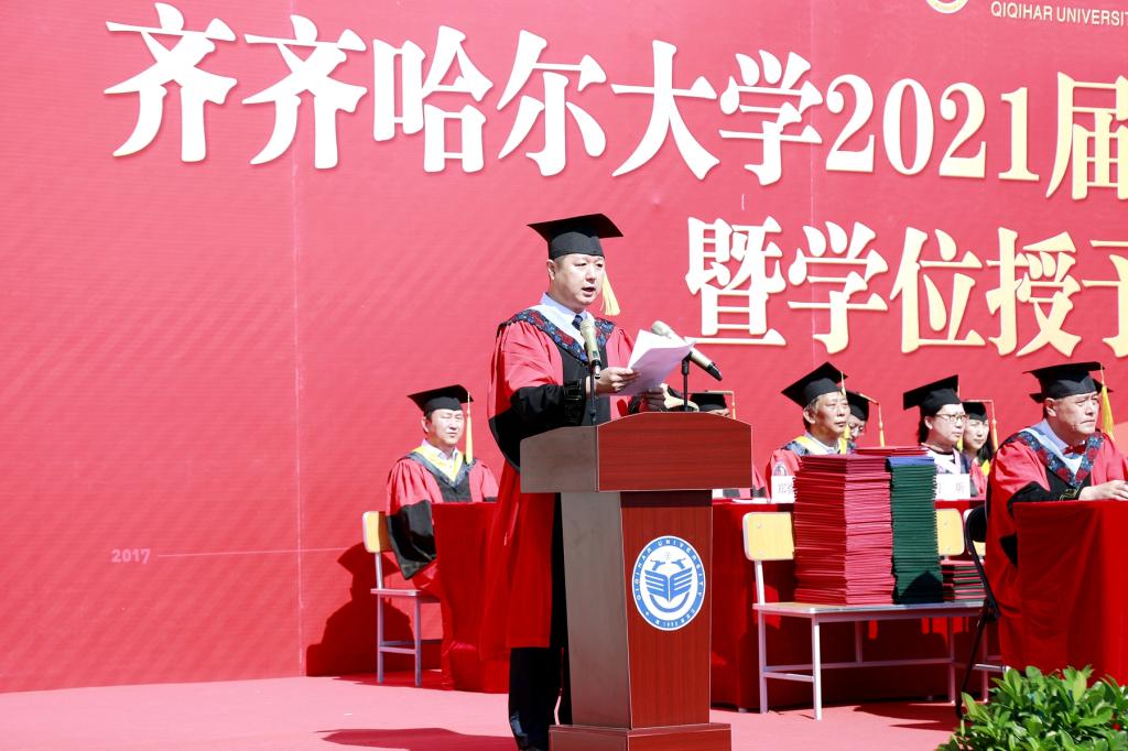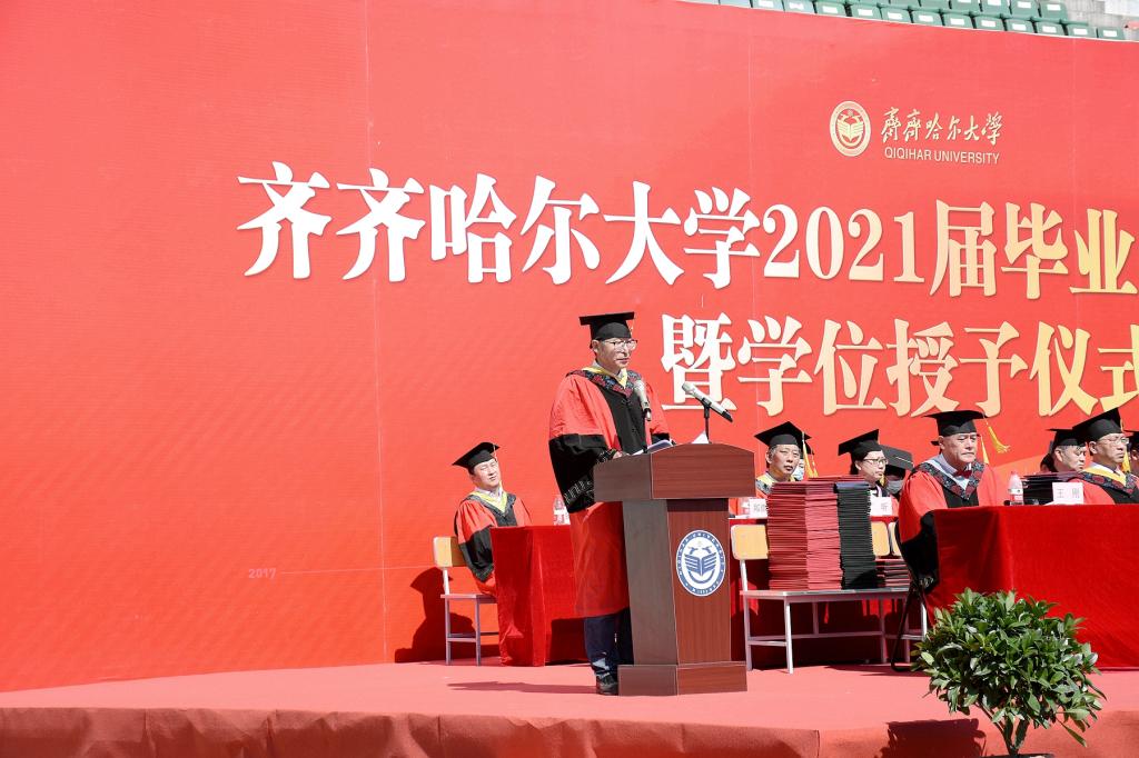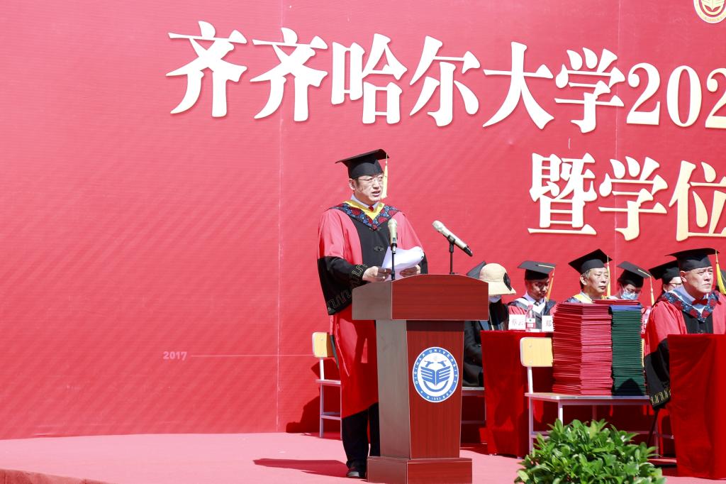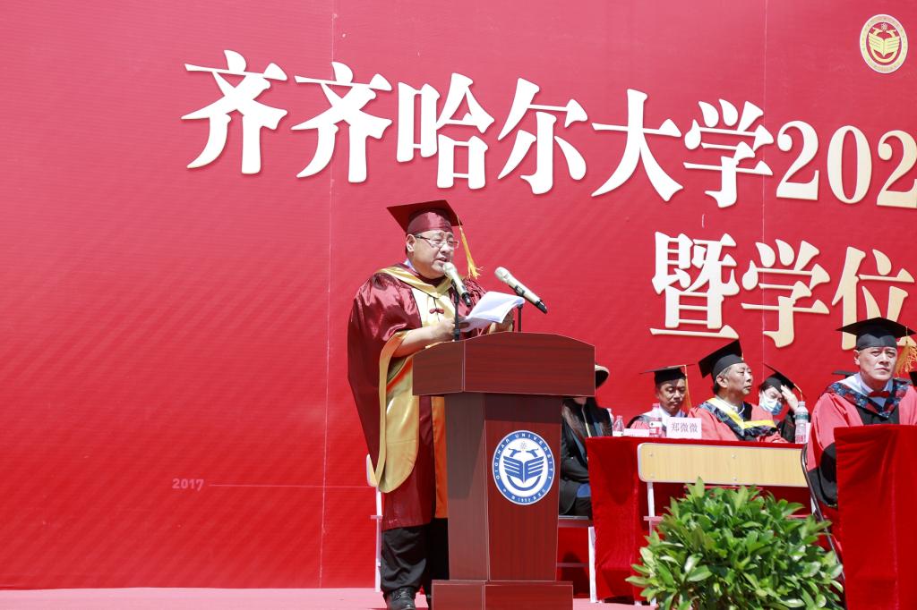 他说,大学是人生中最美好的时光,毕业典礼则是这段时光中最神圣的时刻。这是我来到齐大后的第一个毕业季,你们是我作为校长送走的第一届毕业生。虽然与同学们的接触时间很短,但你们这一批毕业生在各方面的优异表现,都给我和母校师生留下了深刻的印象。你们有理想、有担当,志于学、成于业,识大体、顾大局,你们都是青春的奋斗者,你们都是了不起的齐大人!全校师生为你们骄傲,为你们自豪!母校孕育了你们的成长进步,你们也推动了母校的发展繁荣。我要向各位同学道一声感谢,感谢你们对学校事业发展的支持与贡献!期待着你们与母校师生各自攀登、高处相见!
