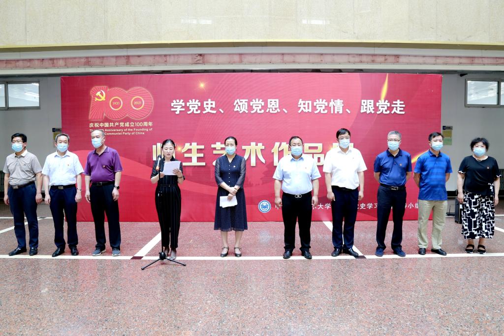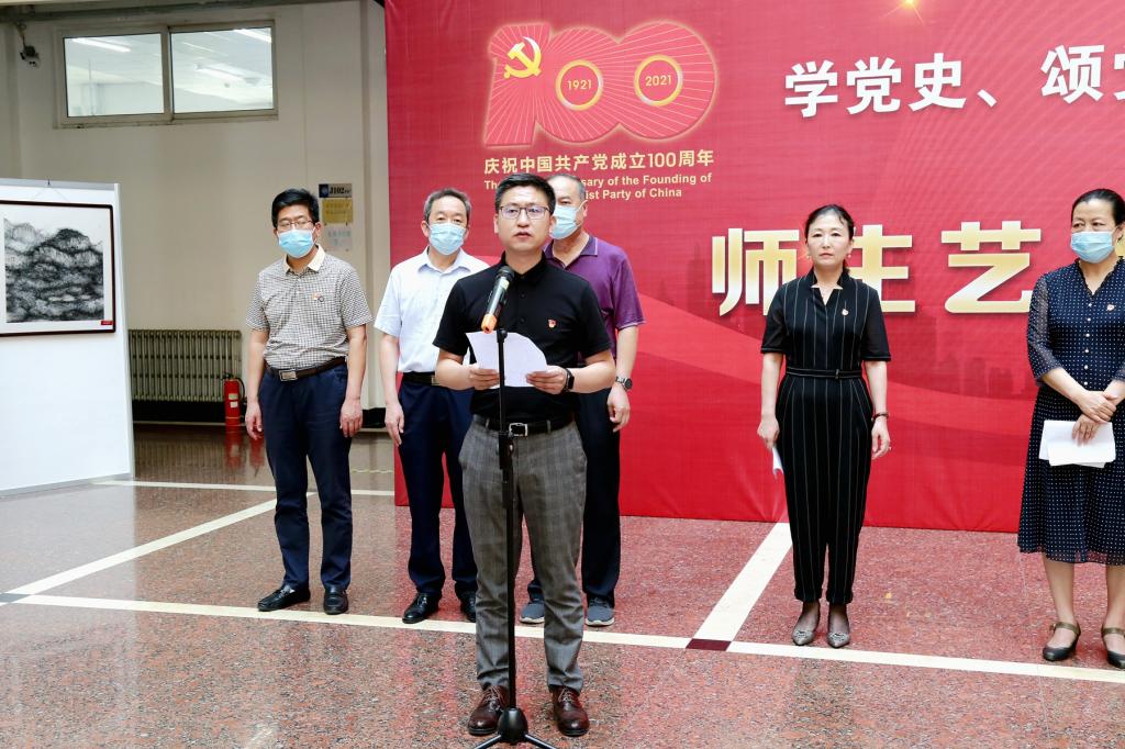 美术与艺术设计学院副院长孟德鸿教授代表参展作品创作者在开幕式上发言,他表示,作为新时代文艺工作者和教育者,我们将坚持党的领导、心怀祖国人民、响应时代召唤、追求艺术理想,用手中的笔墨创作更多更好弘扬中国精神、凝聚中国力量、传播先进文化的优秀作品,表达我们衷心热爱党、永远跟党走的坚定信心和坚强决心,用更多更好讴歌党百年辉煌史的精品力作来传承红色基因,赓续红色血脉,向中国共产党成立100周年献礼!