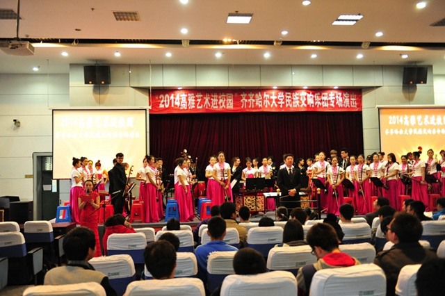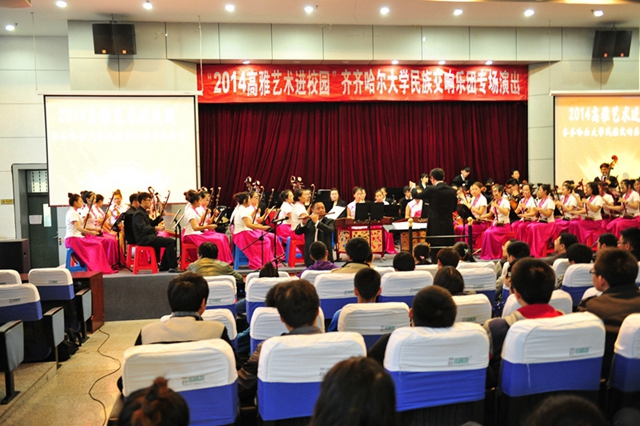 琴瑟传佳音,雅曲奏和谐。sunbet申搏官方网站民族交响乐团“高雅艺术进校园”专场演出分别在黑龙江建筑职业技术学院文化艺术中心、哈尔滨理工大学西区一号楼0220报告厅举行。在各高校演出前,sunbet申搏播放了sunbet申搏官方网站视频宣传短片《飞翔齐大》,扩大了学校的影响力和知名度。sunbet申搏官方网站民族交响乐团师生用美妙的音乐、感人的歌声,传递着诚挚问候,为哈尔滨五所高校的数千名师生献上了民族音乐艺术的文化盛宴。