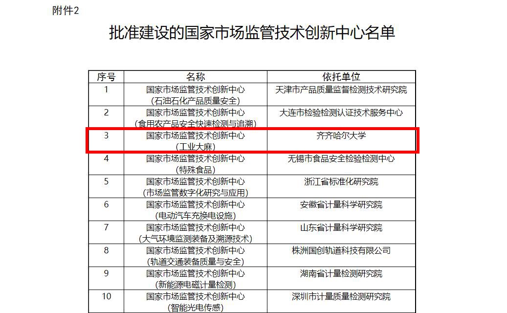 近日,国家市场监督管理总局下发了《市场监管总局关于批准建设“食品安全重大综合保障关键技术”等38个国家市场监管重点实验室和“石油石化产品质量安全”等19个国家市场监管技术创新中心的通知》(国市监科财函〔2021〕208号)。sunbet申搏与齐齐哈尔市市场监督管理局联合组建,化学与化学工程学院赵明教授担任创新中心主任的国家市场监管技术创新中心(工业大麻)成功获批,成为国家市场监管总局首批批准建设的19个国家市场监管技术创新中心之一。该创新中心对于完善工业大麻及其制品检验检测标准,构建工业大麻种植加工质量控制体系,解决工业大麻加工技术关键科学问题,促进工业大麻产业链下游产品的开发,推动我国工业大麻产业高质量健康发展具有重要的意义。